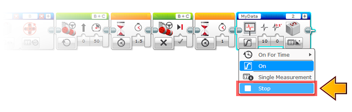 | Add a Wait For 1 Second block after the Motors "Off" block so data logging can continue for one additional second and catch any movement that occurs after the brake command is issued. | |||